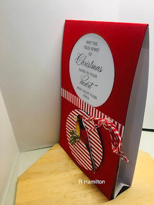 Then taking left over die-cut red cardstock which I saved to use at a future date (like now)...I folded the top over so this would serve as the flap for the card. Using the circular opening as a guide I stamped the words on a piece of white cardstock of the same size. I then made the easel using left over white cardstock and another fresh piece of white cardstock cut 73/4" x5".